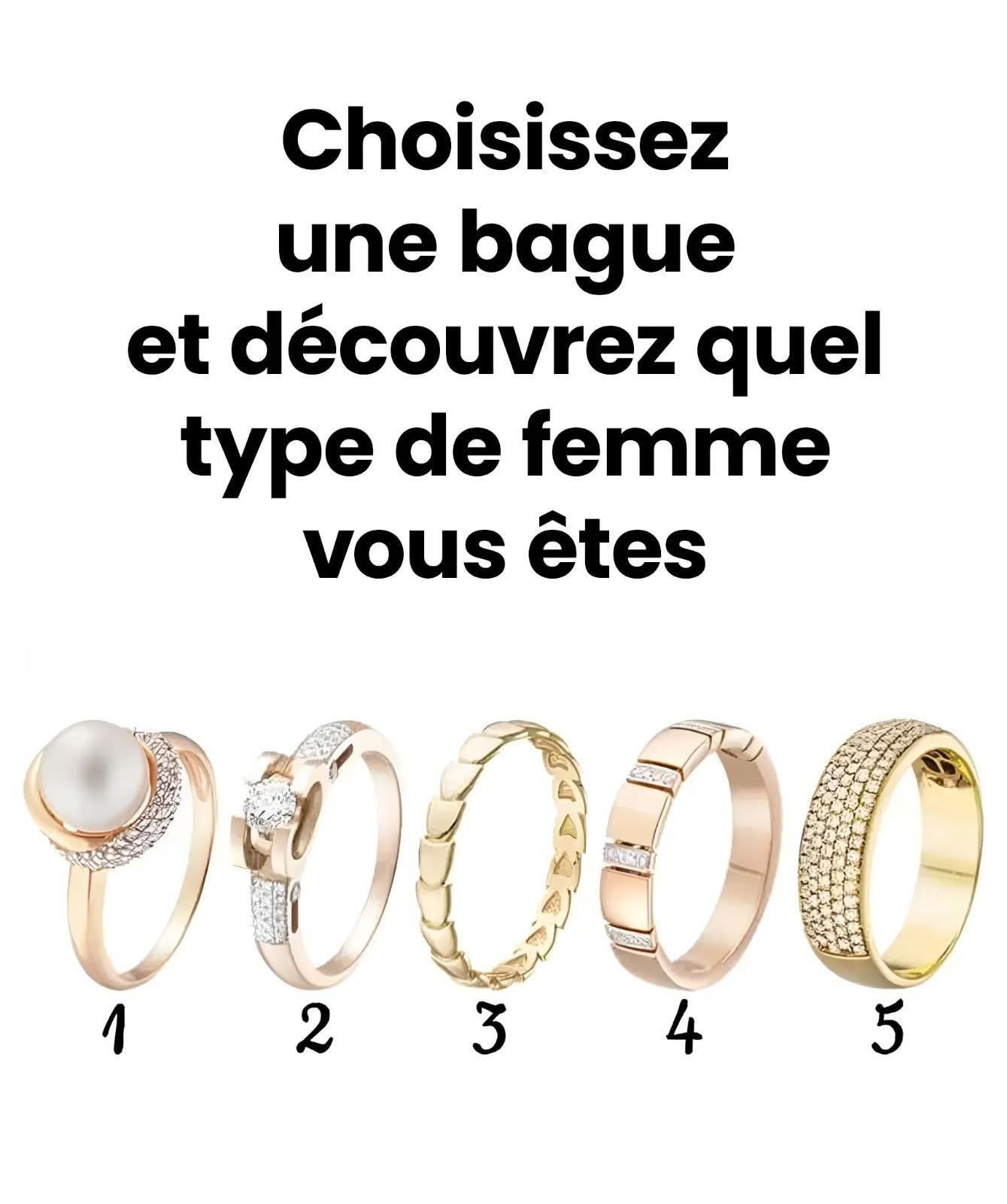 All recipes Choisissez une bague et découvrez quel genre de femme vous êtes . C’est étonnant comme un bijou peut en dire long sur nous. Certaines les aiment fins et discrets, d’autres les préfèrent…